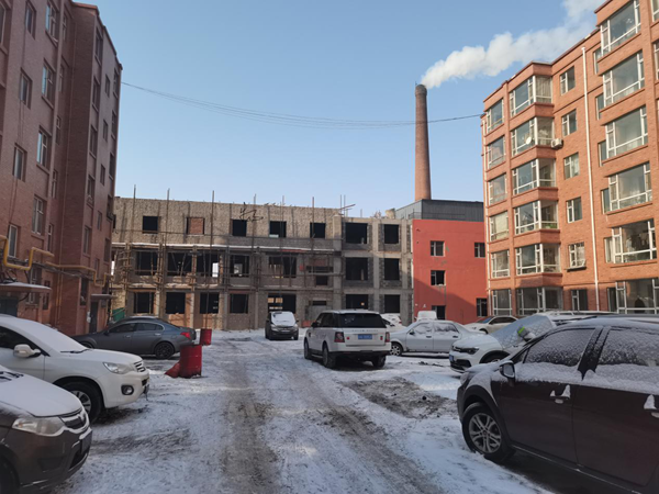据小区居民说:原跃进家园房产开发商姓魏,与李柏辉有债务关系,开发商老魏把原物业办公楼顶账顶给了现在的物业负责人李柏辉,李柏辉又承包了宜居家园和跃进家园两个小区供暖,他借锅炉房改扩建名义,将两栋楼中间空地违建起三层“楔子楼”,目前,这座夹楔楼已经封顶,与原锅炉房和物业办公楼连在一起。
