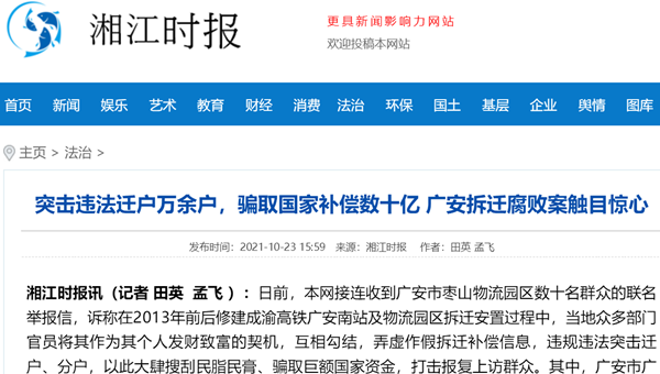 湘江时报讯(记者 田英 孟飞 )日前,本网接连收到广安市枣山物流园区数十名群众的联名举报信,诉称在2013年前后修建成渝高铁广安南站及物流园区拆迁安置过程中,当地众多部门官员将其作为其个人发财致富的契机,互相勾结,弄虚作假拆迁补偿信息,违规违法突击迁户、分户,以此大肆搜刮民脂民膏、骗取巨额国家资金,打击报复上访群众。其中,广安市广安区枣山镇(现为广安市枣山物流园区枣山街道办事处)涉及突击违法迁户逾万户,骗取国家补偿资金数十亿元……为此,记者进行了为期一个月的深入调查和走访。