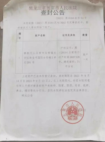 在一期底商的一个门上,记者看到了由哈尔滨市道外区人民法院张贴的查封公告,金禾国际19套房产被查封;在该小区二期,也张贴着房屋被查封的公告。