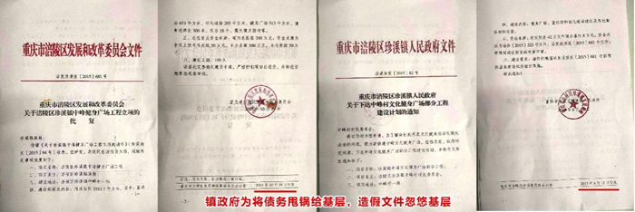 村民们还说:镇领导修建豪华政府办公楼和车库,修建闲置敬老院和卫生院,对抗上级组织检查,造假,将豪华办公楼和车库挂社区招牌对抗组织排査,巧立名目骗取国家项目资金。镇党委书记邱国光如此作风,竟然被提拔为涪陵区生态环境局局长,镇长石以超被提拔为镇党委书记。这些人形式主义、官僚主义、两面人,现任镇党委书记石以超擅自篡改信访材料、诉求,敷衍塞责。之前,珍溪镇政府就出具虚假文件,区政府发改委文件尚未下达,实施文件就提前签发,推诿卸责扯皮,债务让村委承担,严重违背党性原则。镇政府对鞠廷龙垫资修建民生工程建设款1000多万元拒绝支付, 并在鞠廷龙讨要时无任何理由直接罢免其中峰社区党支部书记,不听民意、独断专行,利用领导权力以权压法、逐利违法、随心所欲,报送黑材料使社区书记鞠廷龙被关押15天。目前,鞠廷龙已申请国家赔偿,公安机关已经纠错。现在,鞠廷龙要求聘请第三方机构评估其垫资建设道路等民生工程量,并支付他垫资的成本工程款。鞠廷龙已向中纪委、国家信访局、全国人大、全国政协等单位控告投诉,并已收到信访回执。
