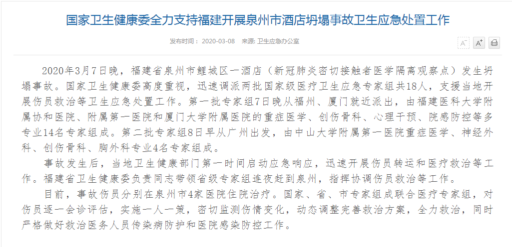 国家卫健委调派18人医疗组 开展泉州坍塌事故救治