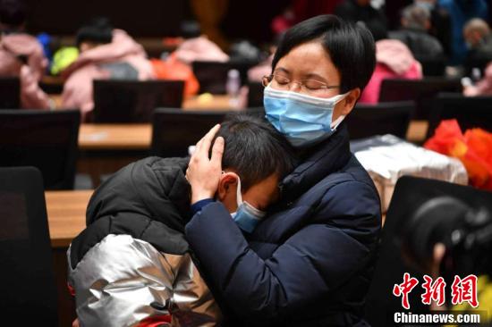 2月16日,云南省老年病医院肛肠科护士长张田芬安慰来送别的孩子。当日,由108名医护人员组成的云南省第五批援助湖北医疗队从昆明长水国际机场出发飞赴湖北武汉,支援当地新冠肺炎疫情防控和救治工作。中新社记者 刘冉阳 摄