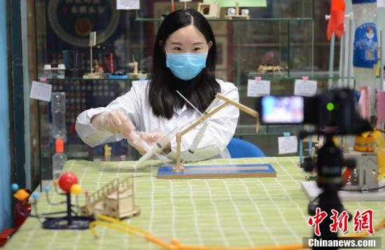 2月16日,老师线上授课,做气压压力小实验。新冠肺炎疫情防控期间,呼和浩特市玉泉区青少年宫的老师们通过线上课堂,让小学生们在家就能通过网络进行声乐、啦啦操、手工制作、科学实验等课程的学习。中新社记者 刘文华 摄