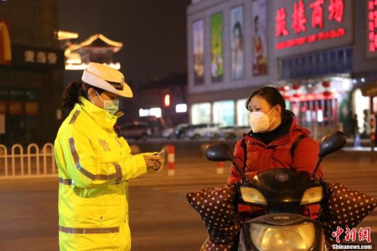 从1月23日起,襄阳市公安局全休民辅警放弃休假,全力奋战在抗疫一线。他们用一个个不眠地值守,点亮了每一个寒冬的夜晚。图为湖北襄阳市樊城区鼓楼十字路口,女民警雷金菊正在劝导街面行人。李杨 摄