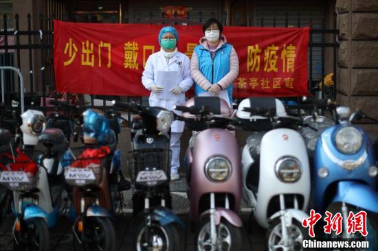 3月2日,南京建邺区南湖社区医院医生于洁(左)、茶亭社区网格员丁芸(右)在茶亭社区担负疫情防控值守任务。中新社记者 泱波 摄