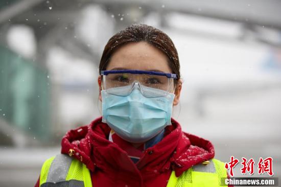 2月21日,沈阳桃仙国际机场,韩放在雪中等待旅客登机。韩放是南航北方分公司地面服务保障服部服务室航班组长,疫情期间,她坚持做好疫情防控工作和南航进出港航班旅客的地面服务保障工作,确保旅客安全、顺畅出行。中新社记者 于海洋 摄
