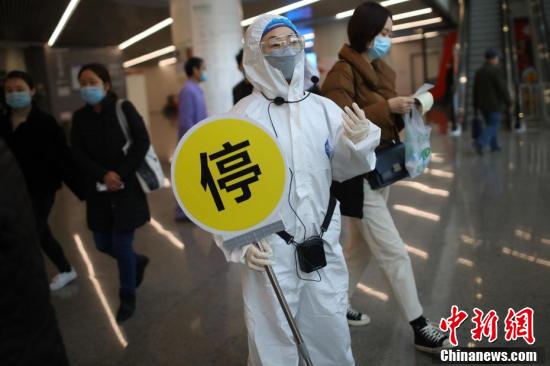2月27日一早,南京市第一医院的医护人员麻利地穿上防护服,戴上护目镜和医用手套,举着“停”和“过”的牌子,走到门诊大厅设立的专用通道,开始一天的工作。自新冠肺炎疫情发生以来,该院在派出医疗队驰援武汉的同时,在门诊和急诊大厅分别设立了阻击疫情第一道“关卡”,从各个科室抽调了医务人员前来“把守”。中新社记者 泱波 摄
