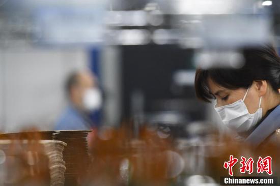 2月19日,位于重庆市两江新区的重庆川仪公司内,复工人员戴着口罩有序进行生产工作。中新社记者 陈超 摄