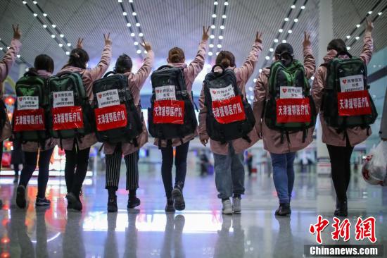 2月9日晚,天津滨海国际机场,天津第五批援鄂抗疫医疗队出征。中新社记者 佟郁 摄