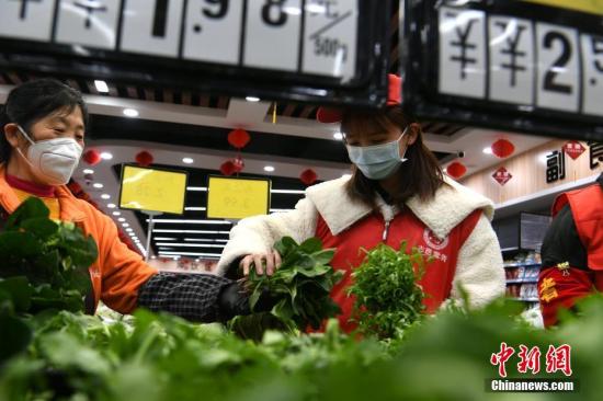 3月5日,在合肥市一家超市,大学生志愿者王束佳为辖区高龄老人代购蔬菜。在安徽省合肥市常青街道沿河社区,18岁的大学生王束佳主动报名参与街道的防控防疫志愿服务,和同事一起参与防疫宣传、跑腿、代购、消毒、值守等。中新社记者 韩苏原 摄