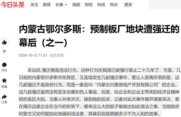 本站讯 强迁便是违法行为,这种行为在我国已被强行禁止二十几年了,可是,几日前的内蒙鄂尔多斯市东胜区,又连续发生几起强迁事件,更让人匪夷所思的是,这几起强迁不是政府行为,而是一家名叫“内蒙古兴蒙房地产开发有限公司”的企业。这几起强迁虽然没有发生命案和伤人事故,但是,给企业和企业主带来的经济及精神损伤是巨大的。当事人叫李济元,接到他的投诉,记者对此次事件展开调查采访,意在揭示这家企业在当今的形势下,哪来这么大的胆子敢做出如此违法之事,当地政府和警方又如何能如此地偏袒违法者,其幕后到底隐藏多少不为人知的故事。