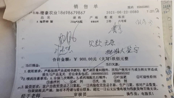 事实上,在樱桃树刚刚出现受害症状时,农户向大连殿龙公司报告过,殿龙公司也意识到问题严重,还派人去樱桃园察看,并开具了“解药”(下图)。但是,所谓“解药”并没有用。