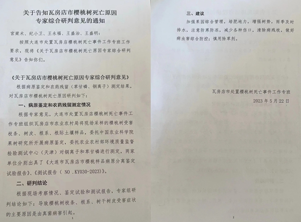 给了这份通知之后,大连市和瓦房店两级农业农村局不再回应关于樱桃树死因的任何质疑。