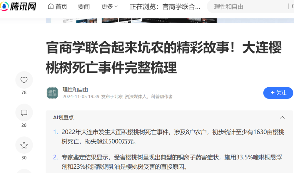 关于大连樱桃树死亡事件,本人之前发过几篇,这一次我完整梳理一下,并把证据附上。我保证绝对让你惊掉下巴——这绝对是载入中国农业史的程碑式案子,将来是值得拍一部电影的。