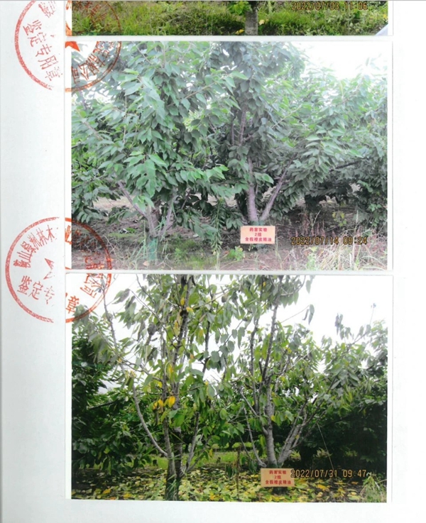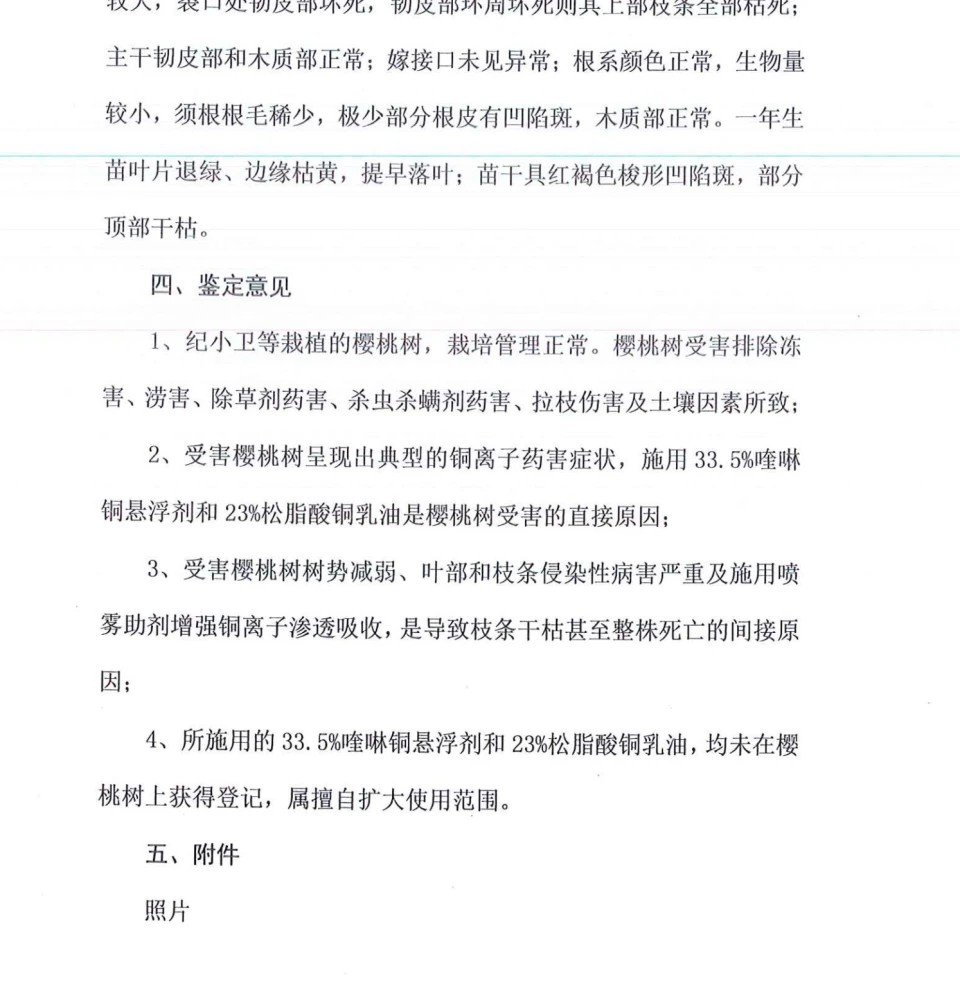 直接上答案。樱桃树死了后,2022年10月,宫梁术、纪小卫等农户请具备司法资质的鉴定机构做了死因鉴定——鉴定团队包括农药专家、樱桃树培育专家以及植保专家,鉴定结论为 “受害樱桃树呈现出典型的铜离子药害症状,施用33.5%喹啉铜悬浮剂和23%松脂酸铜乳油是樱桃树受害的直接原因。(见下图鉴定结论和药单)