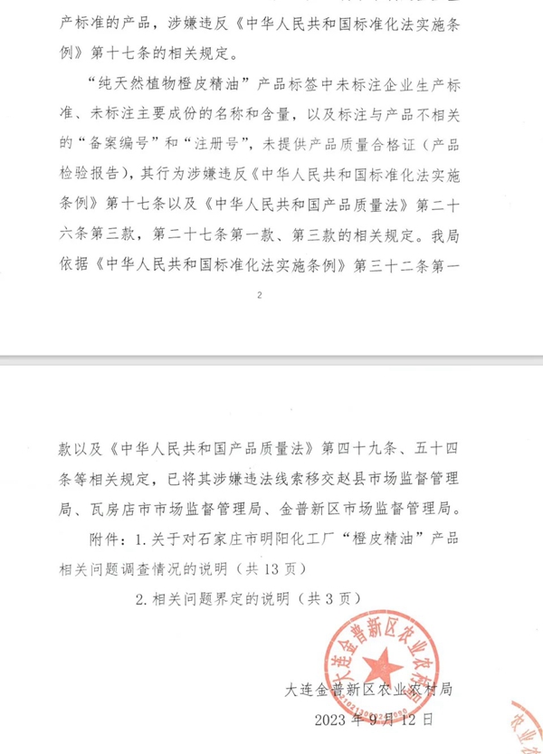 此外,于可伟所使用的“橙皮精油”产品,也是从殿龙公司购买的,该产品检出隐性添加——金州区农业农村局已经回复确认这一问题产品,但一直在踢皮球拒不处理(图7)。
