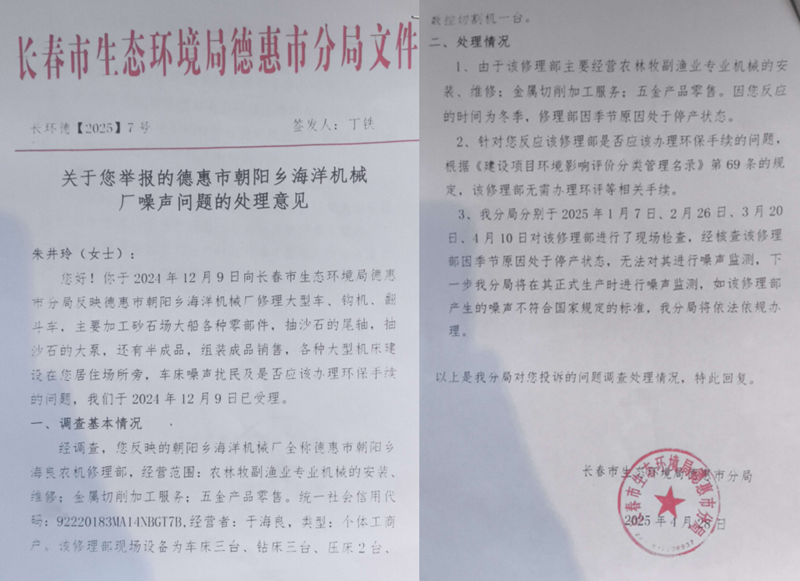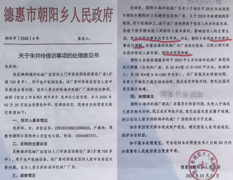 针对朱井玲的上访,2025年4月11日,朝阳乡政府向朱井玲出具了《关于朱井玲信访事项的处理意见书》(朝信字〔2025〕4号),该意见书证实朱反映的问题基本属实,但并未认定海洋机械厂厂房为违法建筑。该意见书称:“经调查,朝阳乡海洋机械厂负责人于海良于2015年在德惠市朝阳乡朝阳村2社建设住宅和厂房,又于2019年新建钢构彩钢房,用于机械加工。由于该厂房地势高于信访人朱井玲家车库,导致下雨天积水流入到信访人家车库内,影响信访人的正常生活,双方也因此事多次发生争执。对此,朝阳乡政府也多次就此事进行调解,并要求海洋机械厂对厂房进行改造,以防止雨天积水流向信访人家车库,但均未实现和解。