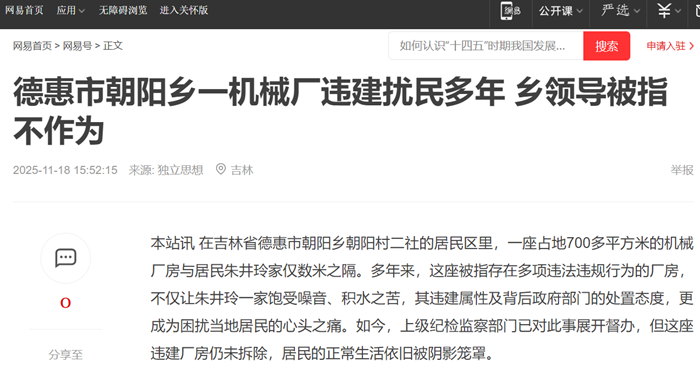 本站讯 在吉林省德惠市朝阳乡朝阳村二社的居民区里,一座占地700多平方米的机械厂房与居民朱井玲家仅数米之隔。多年来,这座被指存在多项违法违规行为的厂房,不仅让朱井玲一家饱受噪音、积水之苦,其违建属性及背后政府部门的处置态度,更成为困扰当地居民的心头之痛。如今,上级纪检监察部门已对此事展开督办,但这座违建厂房仍未拆除,居民的正常生活依旧被阴影笼罩。