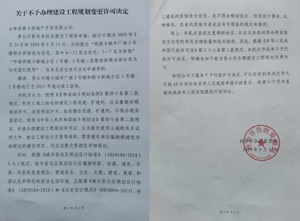 本站讯 苦等了七个月,2020年9月13日,德卡公司终于盼来了吉林省扶余市自然资源局的回复,但还是不予批准。德卡为此叫苦连连:“我们只是申请变更一下房屋用途,而且还是把商业用房变成住宅,但是苦等了半年不给答复。我们起诉其不作为,法院却想法设法为他们开脱责任,通过媒体呼吁,终于给了回复,却依旧是不予办理变更!在扶余,企业办点事怎么就这么难呢?!”