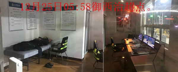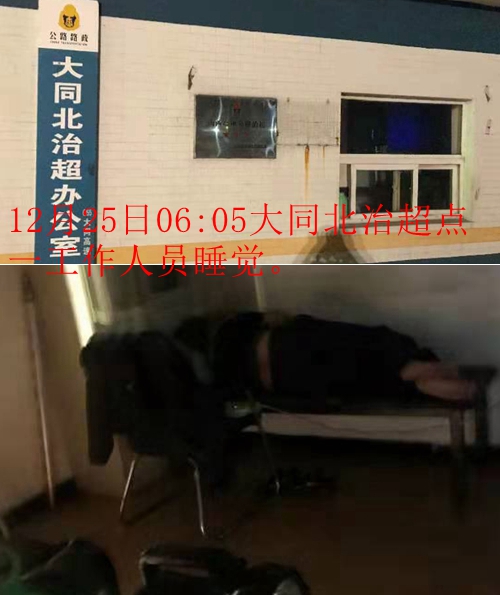 然而,隶属于山西交通控股集团有限公司的大同北高速公路分公司,仍连续出现值班人员缺岗、睡觉问题。有货车司机向本站爆料:近日,山西省大同市境内高速治超点黎明前经常出现缺岗现象。2020年12月22日至25日,记者暗访了大同高速的多家治超点,发现几家治超点不是无人,就是工作人员睡觉。12月22日07:39,在大同东治超点发现,室内无人值班,只有一台亮着的电脑。12月23日07:15,记者来到御河西路治超点,大货车时断时续从该治超点门前磅上通过,但没有亮灯的室内一工作人员正在熟睡,期间只有3台开着的电脑在值班。12月23日07:21,记者在大同北治超点发现,没有工作人员值班、没有锁门、室内没有开灯、只有亮着的三台电脑和室外墙上挂着醒目的一块(山西省高速公路管理局授予该站“山西省高速公路治超三星荣誉”)荣誉牌。12月24日07:05,大货车不停经过该站点门前,但室内无人。12月24日07:34,记者在巨乐堡治超点发现,治超点室门紧锁,货车呼啸而过,也不知是否超载超限。记者在该站一直等到08:35,发现该治超点还是没有一人。12月25日05:58,记者再次来到该治超点,一位工作人员又在室内睡觉。12月25日06:05,该治超点的一位工作人员在室内睡觉。12月24日06:14,记者在云冈治超点发现,室内无人、两台亮着的电脑、室门紧锁。12月25日06:25,该治超点一位工作人员在睡觉。12月24日06:32,记者在兴王治超点发现,室门紧锁、两台电脑还亮着。12月25日06:37,记者发现无人的该站点室门依然紧锁。(记者 峻岭)