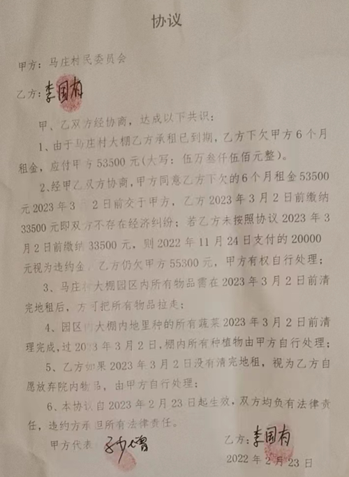 在李国有阐述中,当地村支部书记马少增带领当地村民把李国有、李瑞锋、王保围了起来。在村书记马少增、中牟县黄店镇人大主席陈博旗、黄店镇纪委书记耿辉等相关领导协调下,李国有与马少增书记及当地村民就经济纠纷问题,经协调达成以下协议: