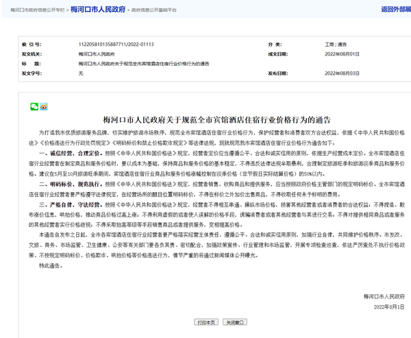 2022年8月3日和今年4月25日,梅河口市人民政府发布了关于规范全市宾馆酒店住宿行业价格行为的文件,2022年8月3日在其政府网站发布中称:建议在5月至10月旅游旺季期间,宾馆酒店住宿行业商品和服务价格涨幅控制在淡季价格(非节假日实际结算价格)的50%以内。