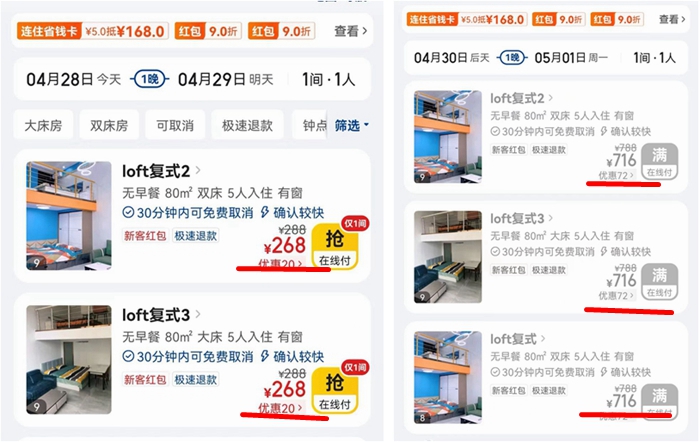 打开一些APP搜索梅河口市的一些宾馆和民宿发现,五一期间这里住宿价格暴涨,一家连锁宾馆4月27日大床房标注当晚入住价格为164元,而4月29日至5月1日这三天,每晚的价格却涨到了419元至423元,其店员表示就这三天住宿价格有所调整。当地一家酒店4月28日入住房型标注当晚入住价格为268元,而4月29日至5月1日期间,每晚最高的价格却涨到了716元!一家民宿经营者表示平时210多元的房间这几天小长假涨到了400左右,她家的涨幅算是同行业比较低的。