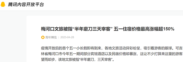 疫情开放后的首个五一小长假即将到来,各地文旅活动异彩纷呈,吸引着游客的眼球。可吉林省梅河口市今年五一期间部分宾馆酒店以及民宿价格却暴涨,这让不少打算来这里的游客望而却步,该地文旅被指“半年磨刀,三天宰客”。