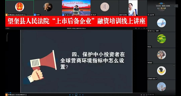 为进一步推动区域性股权市场发展,鼓励企业挂牌融资,增强企业负责人对资本市场及企业上市的了解,加大力度推进企业上市工作,切实保护中小投资者合法权益,持续打造优质法治化营商环境。黑龙江省望奎县法院于近日组织召开“上市后备企业”融资培训线上讲座,县开发区内14家企业负责人参加本次线上讲座。