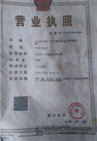 恰逢此时,九台市政府号召广大村民大力发展农村果木经济,极力向村民推广蓝莓的种植技术,李岩看好了九台市政府规划的果木发展前景,于2010年4月初在当地的工商部门注册了“九台区卡伦一代天骄苗木花卉种植基地”。