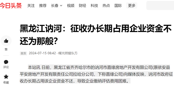本站讯 日前,黑龙江省齐齐哈尔市的讷河市嘉缘房地产开发有限公司(原依安县平安房地产开发有限责任公司拉哈分公司,下称嘉缘公司)向媒体反映,讷河市政府征收办长期占用该企业资金不还,导致企业缴纳评估费用困难。