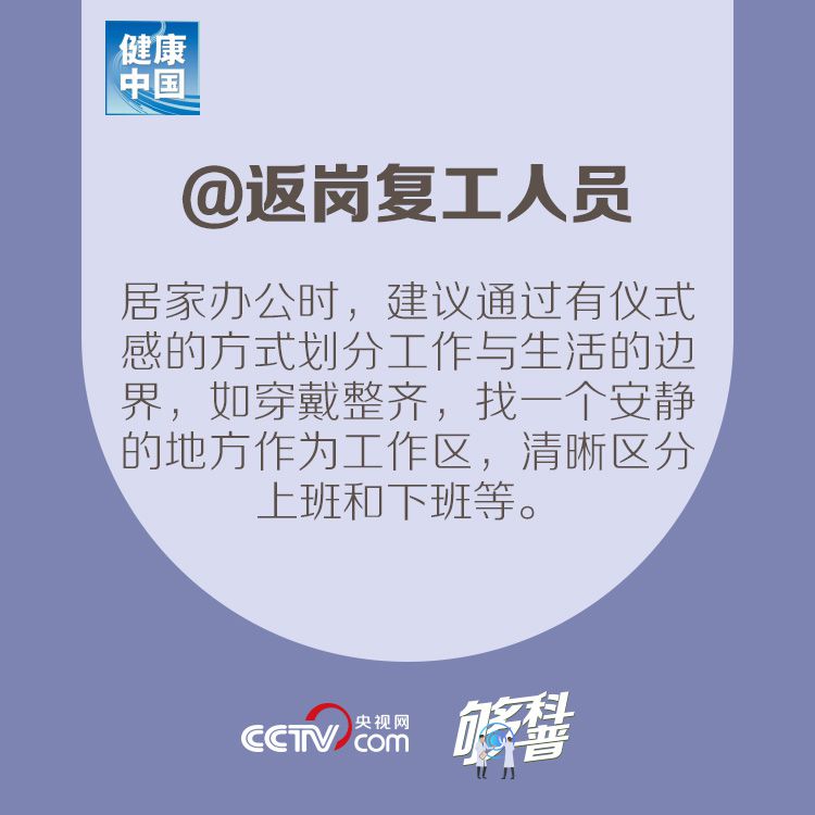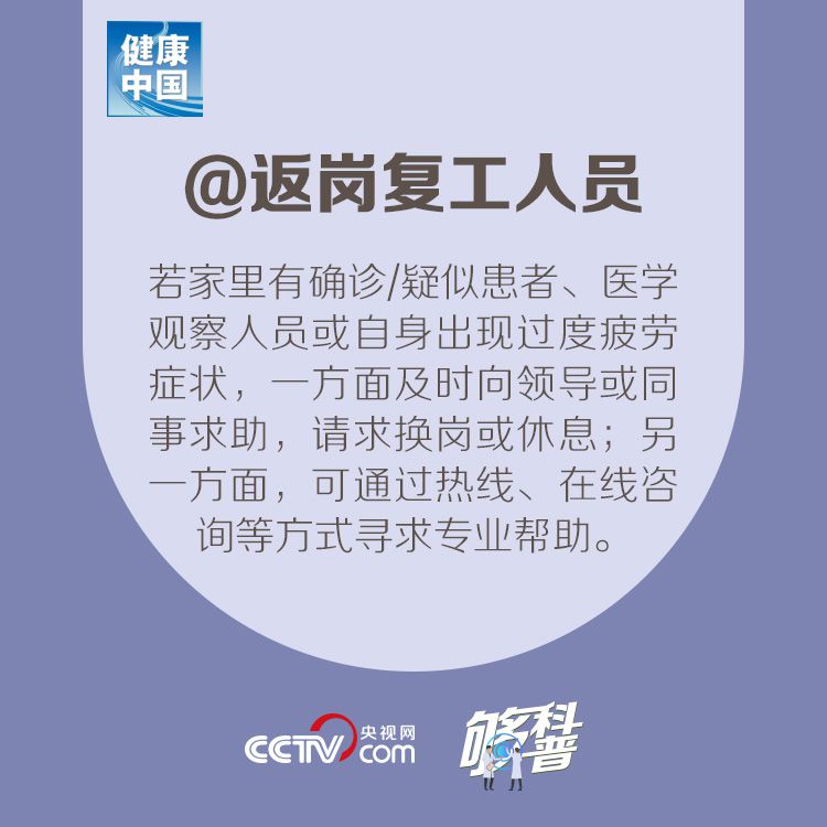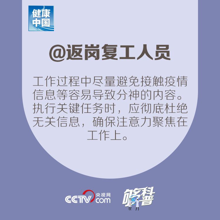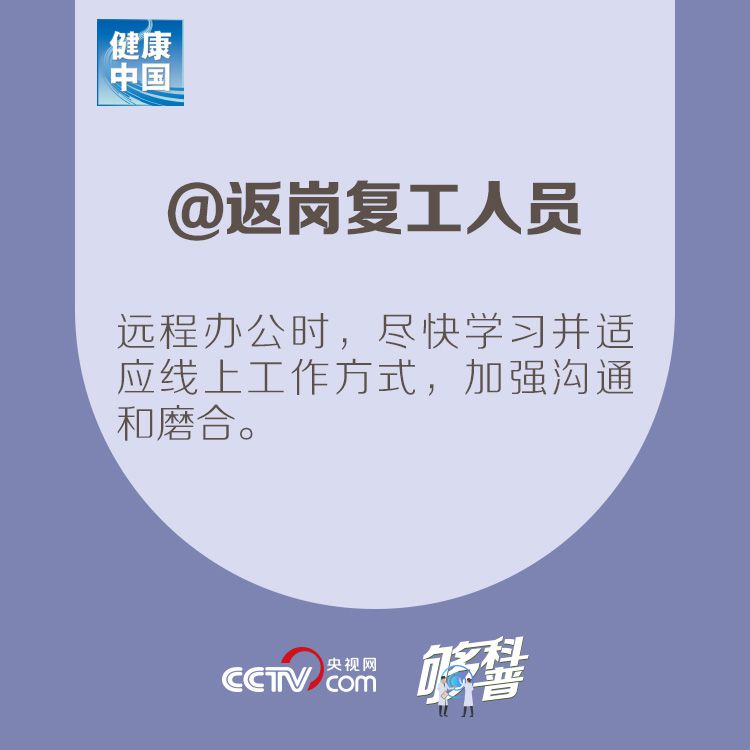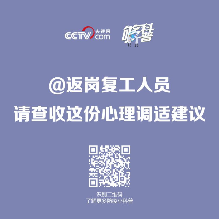 央视网消息:新冠肺炎疫情尚未结束,已有不少人返回到工作岗位上了。在做好个人防护的同时,返岗复工人员该如何做好心理调适,尽快进入工作状态呢?请收下这份心理调适建议。