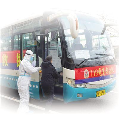 武汉市消防救援支队三级消防士汪磊在武汉市硚口区沿河大道转运密切接触者。记者 申少铁摄