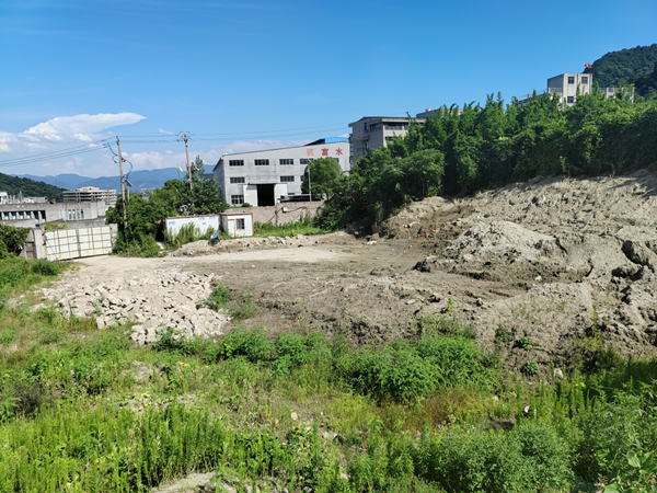 山坡对面是一家个人打房基础水泥混交护坡待建房子的用地。而此处就在山门口腹地上,现场有钢筋骨架,还有小型水泥搅拌机。据此处施工人员讲:山坡脚上林木是村里砍伐的,不知道为什么砍伐。