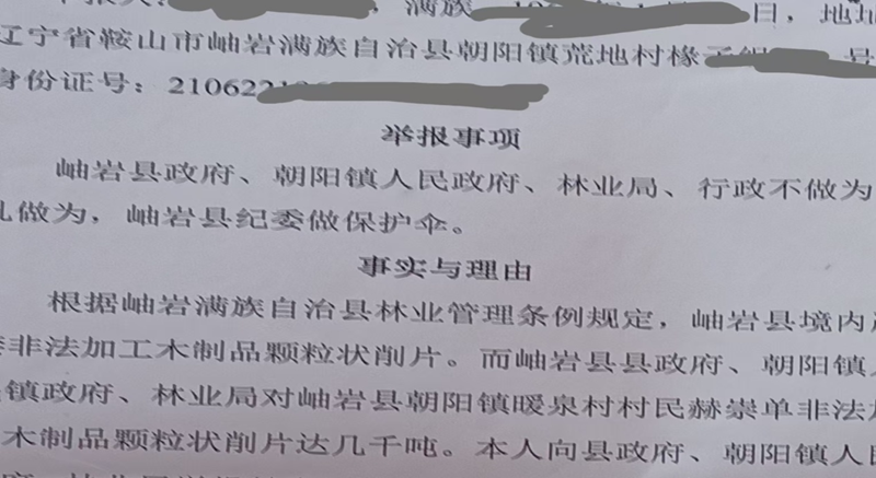 辽宁省的岫岩是个满族自治县,地处辽宁东南部,境内全是山区,建林业生态县是这个县每一任领导必喊的口号。可是,近些年来,全县林地不仅没有增加,反而不断地减少,原因是这个县从政府到林业主管部门,将保护绿水青山只停留在口头上,众多林业部门的执法人员甚至参与到盗砍林子这违法事当中,县内木材粉碎加工点到处都是。接到村民举报,记者对此事进行了调查采访。