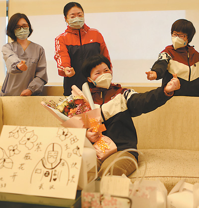 浙江省第四批支援武汉医疗队队员张薇(前)3月8日这天过生日,队友特意送她一幅简单而温馨的画。 |