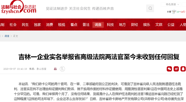 吉林一企业实名举报省高级法院两法官至今未收到任何回复
