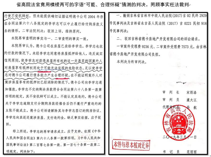 三,更令德卡公司不能理解的是,在高院关键证据居然被消失,法官竟采信假证,用模糊性、推测性语言下判决。高院的判决决书称:“本院再审认为,德卡公司在房屋已卖给李学志,李也依约付款的情况下,未经李学志同意将房屋抵押给他人,违反诚实信用原则,使李学志对获得房屋所有权的这一交易目的因案外人对房屋享有抵押权而处于可能无法实现的危险状态,足以使李学志对德卡公司履行债务能力产生合理怀疑……李学志不交纳剩余房款符合合同法第六十八条第一款第四项的规定,其不安抗辩可以成立,不能认定其违约,德卡公司关于李学志逾期支付分期购房款经催告后仍不履行严重违约的主张不能成立。德卡公司诉请解除其与李学志签订的购房协议、李学志向其返还案涉房屋、支付违约金,缺乏事实依据,应予驳回。”