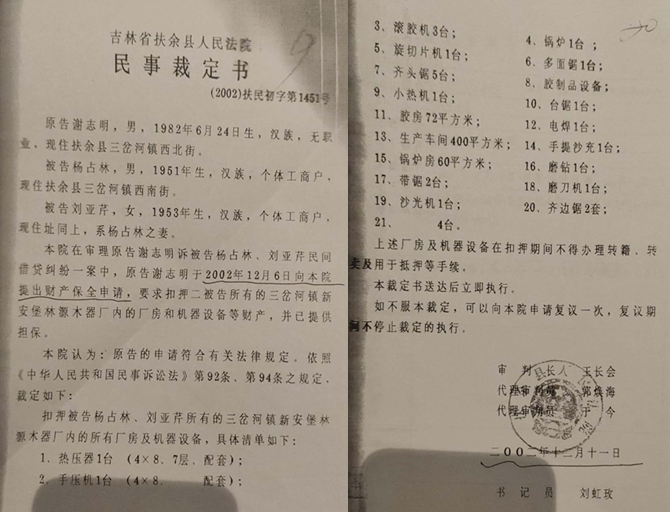 期间,因为刘亚琴曾经向谢志明借过钱,谢因刘外出找不到人于2002年12月6日向扶余法院申请诉前财产保全,要求扣押刘亚琴厂房和设备,扶余法院于同年12月11日对刘亚琴的厂房和设备进行了扣押,并随后下达了执行裁定书。