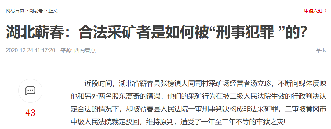 本网讯 近段时间,湖北省蕲春县张榜镇大同司村采矿场经营者汤立珍,不断向媒体反映他和另外两名股东离奇的遭遇:他们的采矿行为在被二级人民法院生效的行政判决认定合法的情况下,却被蕲春县人民法院一审刑事判决构成非法采矿罪,二审被黄冈市中级人民法院裁定驳回,维持原判,遭受了一年至二年不等的牢狱之灾!