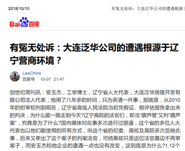 因安玉杰的事,有多位记者先后去辽宁和大连进行了采访报道,并先后发表了如《强抢民企一亿多:辽宁法官“以假证假”或成帮凶》、《对辽宁高法违法法官的举报:88封举报信缘何无一部门受理?》以及《一亿多的标的下,辽宁法官缘何即当“葫芦僧”又判“葫芦案”?》这些报道,目前在搜狐、腾讯、百家号、凤凰、网易等多家大网站上,还能搜出上百条。这些报道的发表已引起极大关注和反响。大连泛华担心辽宁的有关领导看不到这些报道,还将这些报道打印好,通过邮寄给他们秘书的方式,确保他们能够收得到。