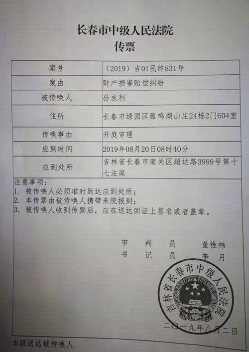 据长春中院(2019)吉01民终831号裁定书记载,孙永利没有到庭的原因是:“上诉人孙永利、李秀平经传票传唤无正当理由拒不出庭”。但据孙永利介绍:我们当时留的“邮寄地址”是位于临河街上的一个始终在正常营业的律师事务所的地址(圣豪汇商大楼603室),法官为什么不向此地址邮寄送达开庭传票呢?经我们查阅卷宗,法官就是没有给我们下达过开庭传票,卷宗里没有开庭传票的送达回证。