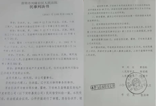 日前,孙洪芹向媒体投诉称:当初自己虽然是为了挣钱借给对方钱,但也是出于好心帮助对方救急,没想到他们借了钱就开始耍赖了。经过多次诉讼,我最终赢了官司,对方也没有上诉,判决书早已经生效快五年了,兴隆台区法院却迟迟不给执行,她曾经多次申请执行均无果,办案法官都换了好几个了,此案也没有进入执行程序。她说,为了要回这点钱,她精神都快崩溃了,更谈不上生意了。她盼望媒体能关注此事,让那些老赖见见光,也让法院领导重视一下,不要让好心人付出金钱后再寒心、流泪。