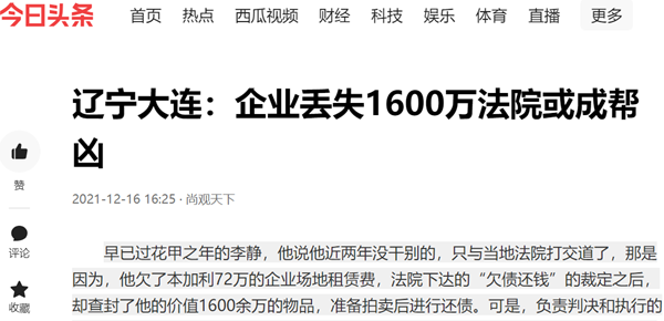 早已过花甲之年的李静,他说他近两年没干别的,只与当地法院打交道了,那是因为,他欠了本加利72万的企业场地租赁费,法院下达的“欠债还钱”的裁定之后,却查封了他的价值1600余万的物品,准备拍卖后进行还债。可是,负责判决和执行的辽宁省大连市甘井子区人民法院,在对李静财产查封时没有下达裁定,更不知道何时解封。当发现被查封的财产已经被他欠钱的企业全部私自变卖之后,李静找到负责执行的法官,这位法官在承认这些财产还没有解封时,还说出了“我不管”三个字。于是李静认为,这家企业在私自变卖他财产时,是经过这位法官同意的,甚至他们是串通好了的。从最初查封时不走必须走的法律程序,到最后的1600万财产被侵吞,这执行局乃至法院的相关领导,都是早商量好的,而自己则一点点步入了他们的圈套。