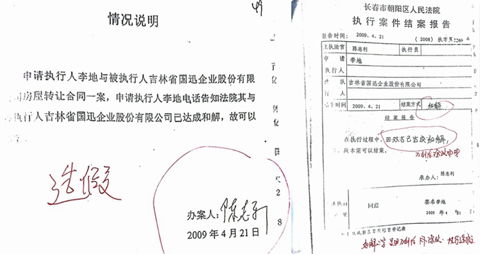 那究竟是怎么“和解”的呢?卷宗里,法官陈志利出具的一份《情况说明》是这样描述双方如何达成“和解”协议“结案”的:“申请执行人李地与被执行人吉林省国迅企业股份有限公司房屋转让合同一案,申请执行人李地电话告知法院其与被执行人吉林省国迅企业股份有限公司已达成和解,故可以结案。”也就是说,法官仅凭利益一方李地的一个电话,就认定双方已经达成了“和解”,并据此结案!这令中联公司十分震惊。