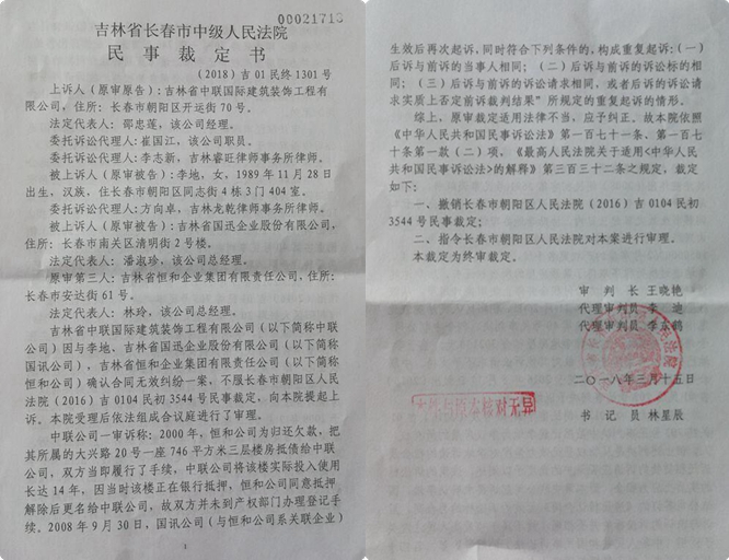 中联公司认为,3544号裁定是一个明显的违法裁定,法官张奇之所以做出这一裁定,就是为法官张芳挡剑、背书。2017年10月16日,该公司再次提起上诉。长春市中级法院于2018年3月15日做出(2018)吉01民终1301号民事裁定书,该裁定书称: