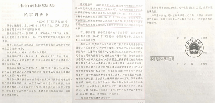 本站讯 家住吉林省延吉市的张轶骥(包括张振峰,系张轶骥父亲)这几年够郁闷的,原因是吉林省白河林业局一个下属的安图县红石采石场(以下简称采石场)违法占地被叫停后,他与其所签的合同被迫终止,他向采石场和林业局索要赔偿未果后,试图通过法律途径维权,却遭到白河林区基层法院(以下简称林区法院)的阻断。在他看来,林区法院关于他的判决存在诸多问题,属于枉法裁判,但是他通过很多途径维权试图再审,至今无果。
