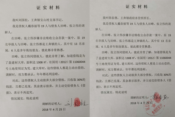 见到记者时,张立伟说:我们是从1993年的3月1日开始做建材商店这个生意的,因为货多没地方放,在2009年盖了一个大库房,因为盖房用了很多钱所以资金短缺,在2010年就从亲属借钱进货用。这些亲属相信我们为人,都愿意借给我们。我们一共从亲友手中借了94.15万,在2010至2016年间给他们本息共52.9万,判定书说100800元是不对的,是他们编造的。另外,还有两名亲属在法院起诉是民间借贷,借据在法院那边。公安抓我们时,我们在讯问笔录上已经说我们有货、办公房和库房,有能力偿还(我们借他们是94.15万元,还本息52.9万元元,还有收条和货物条7.36万元,经镇村干部调解还他们28.245万元)。