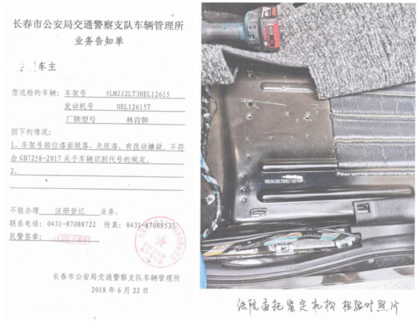 林肯车被拖回后,李先生于2018年6月22日去长春市车管所办理牌照,被交警告知车辆大驾号处漆面脱落,无底漆,有改动嫌疑,不予落户。