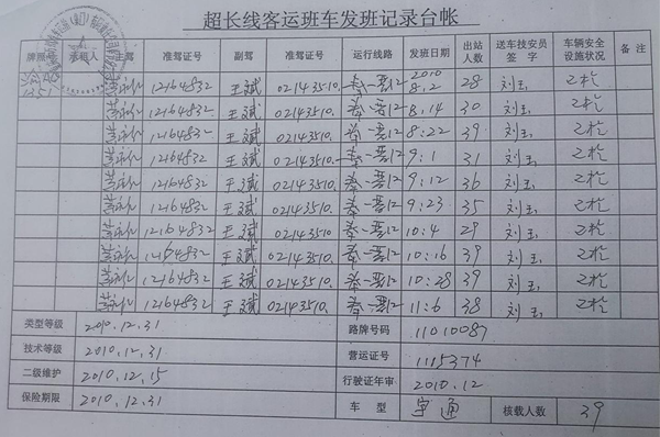 上图:黄永红在重庆万州汽车总公司上班时客运发班记录台帐